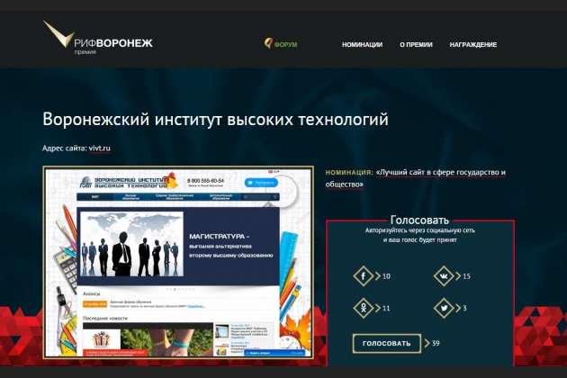 Друзья!!! Воронежский институт высоких технологий участвует в интернет-премии «РИФ-Воронеж 2014» в номинации «Лучший сайт в сфере государство и общество». Нам очень нужны ваши голоса в голосовании.