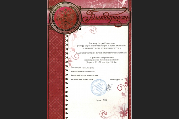Студентки Воронежского института высоких технологий Исакова Маргарита и Золотарева Ирина представили доклад «Роль молодежи в активизации инновационной деятельности». По окончании конференции они были награждены грамотами.